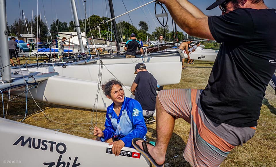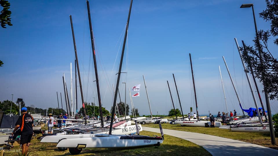 Our F16 mixed team of Sophie and Simon were going fast, they were solid on the course and pulling good results. Their starts were scorching, their boat handling excellent and they grinned BIG smiles when we caught up to them after the racing as we bobbed about for the next start. They were equipped with a standard sail and beat us 3 out of 4 races. Their finishes within the combined F18/16 class over the line were in the top 4-6 boats. They had the distinct advantage of when leaving the leeward centreboard down at the bottom mark they were able to fix it, not nearly kill a Taipan sailor with a dodgy tack as we did.